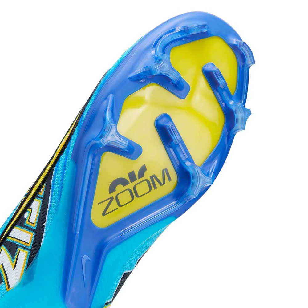 Kylian Mbappé’s explosiveness, plus his twitchy change of direction, puts him firmly in the world class of finishers. With nods to his heritage, this cleat is made to help you play just like KM—with blinding pace and purpose. We added a Zoom Air unit, made specifically for soccer, and grippy texture up top for exceptional touch, so you can dominate in the waning minutes of a match—when it matters most.